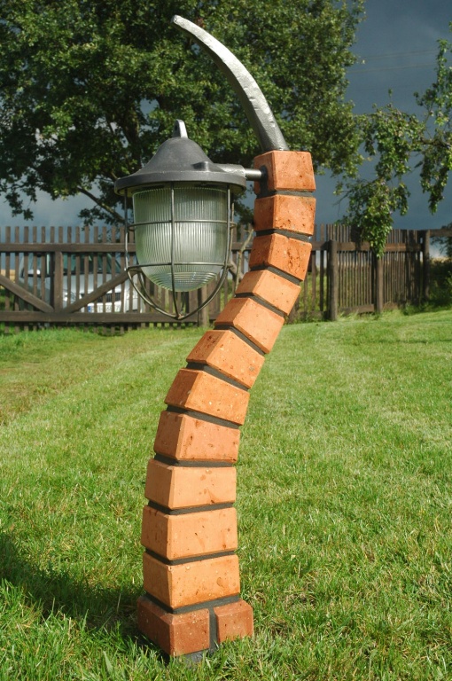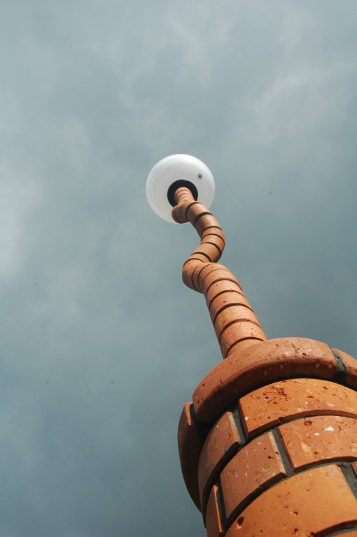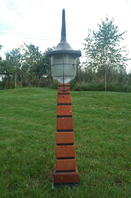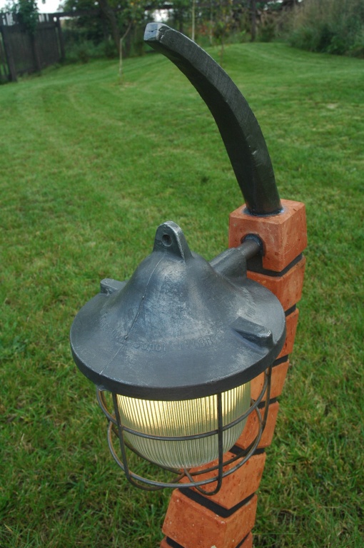 Wykonana z cegły ceramicznej Oprawa - klosz stalowy po renowacji Wysokość 0,9 m Wysokość oprawy 0,7 m